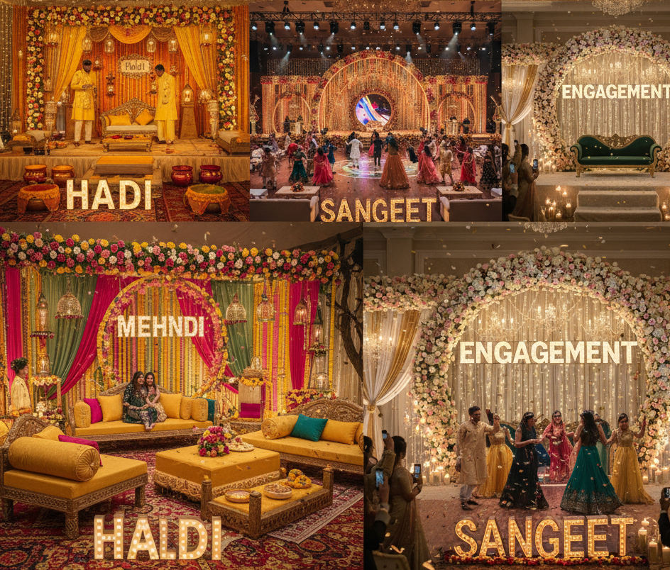 Celebrate your Haldi, Mehndi, Sangeet, and Engagement ceremonies with an unforgettable blend of style, creativity, and elegance. Transform your special days into vibrant experiences filled with color, culture, and celebration. Our thoughtfully curated décor brings together modern aesthetics and traditional charm, ensuring that every ceremony becomes a joyful, picture-perfect memory for you and your loved ones. We craft each event with attention to detail—right from thematic concepts and décor elements to lighting, seating, and personalized touches that reflect your story and style. Whether you envision something subtle and graceful or bold and festive, we design setups that elevate the mood and create visually captivating moments.